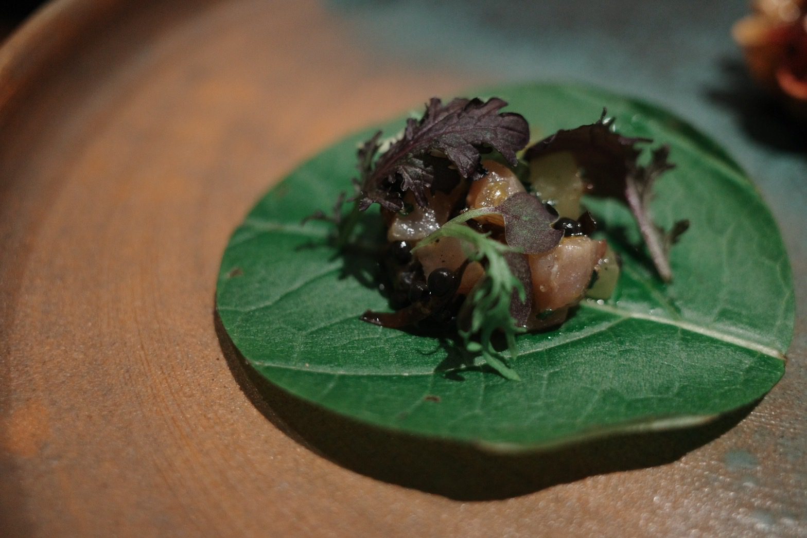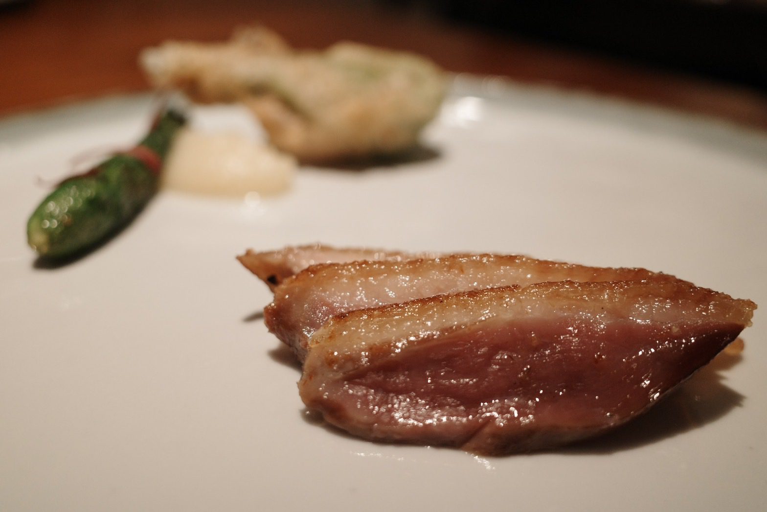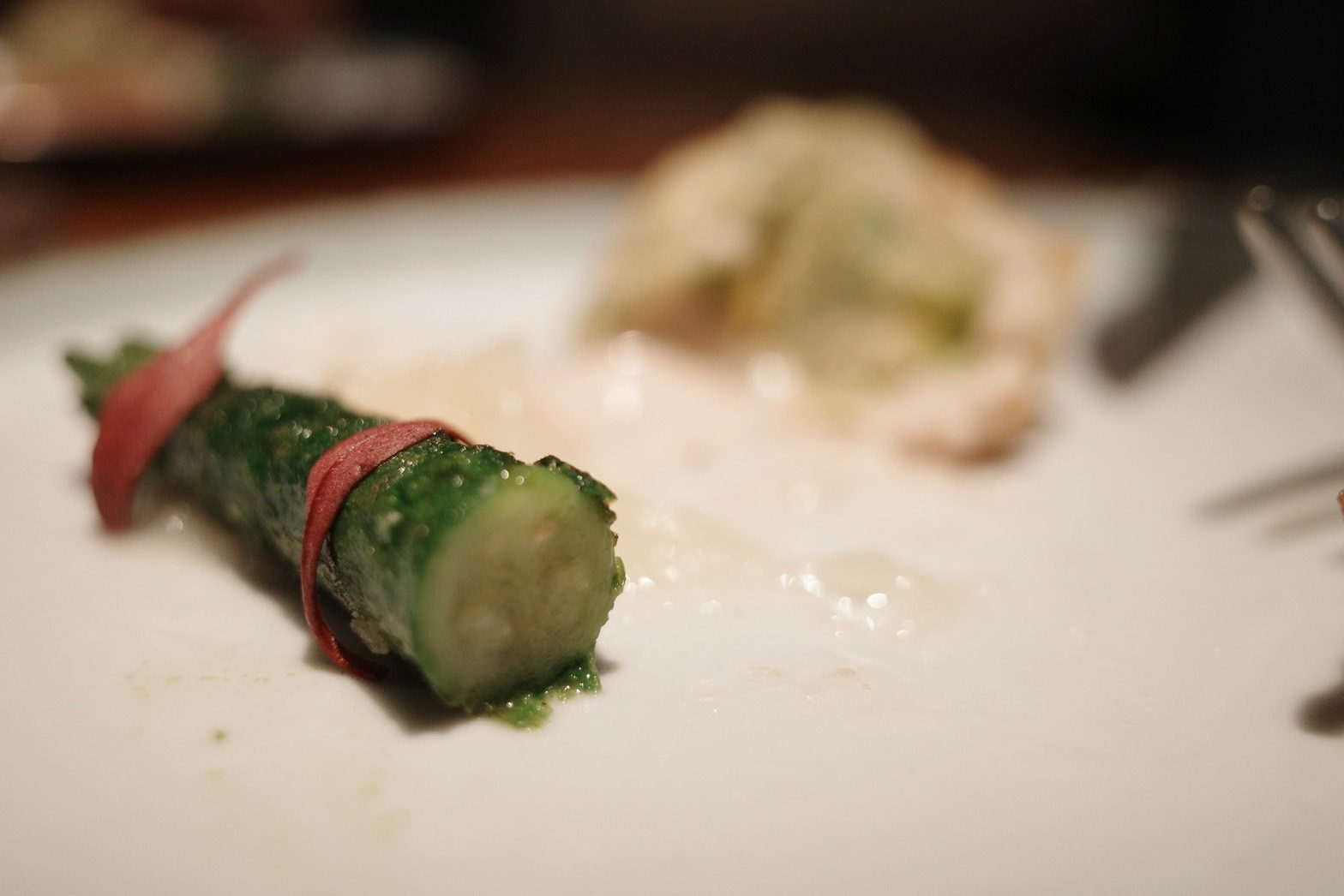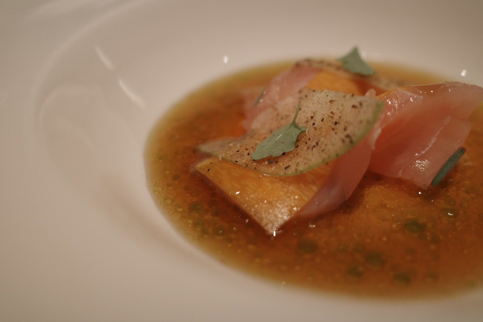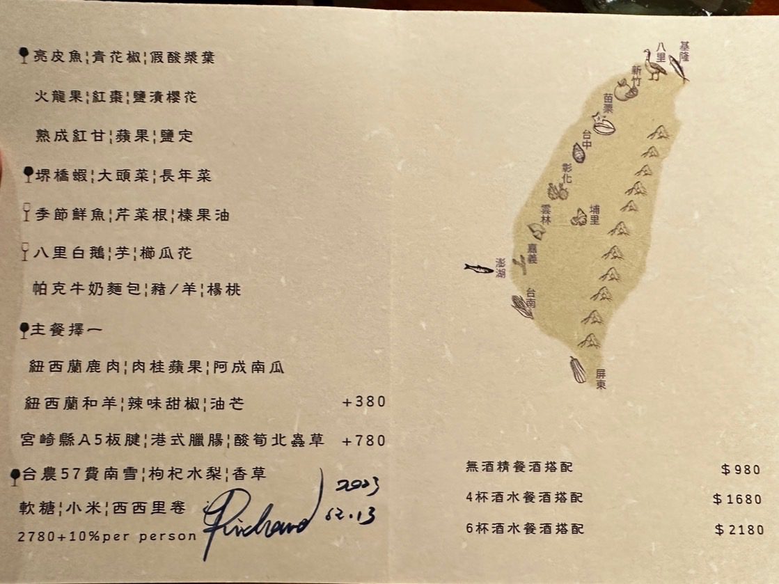【VG Encore】鯤島之西,文不對題但不減美味的饗宴,首嚐鹿肉、櫛瓜花、櫛瓜梗、芋香冬瓜,泡在甜湯裡的費南雪Wen2023 年 2 月 19 日偶爾吃大餐 有位美食同好跟我說,去吃一家餐廳時,要先了解餐廳、主廚的背景,這樣才比較能吃懂餐廳想表達的意境。 本文目錄 VG Encore好吃嗎?VG Encore訂位、交通VG Encore價格VG Encore菜單迎賓湯亮皮魚 青花椒 假酸漿葉火龍果 紅棗 鹽漬櫻花柏露酒造 Hanabi 柏露花火 氣泡清酒熟成紅甘 蘋果 鹽定不在菜單上的鯛魚燒堺橋蝦 大頭菜 長年菜Ippolito 1845 Mare Chiaro Bianco季節鮮魚 芹菜根 榛果油Jean Loron Bourgogne Montvallon 2018八里白鵝 芋 櫛瓜花Grosjean Valle d'Aosta Torrette DOC 2020帕克牛奶麵包 豬/羊 楊桃無酒精 楊桃汁氣泡主餐A 紐西蘭鹿肉 肉桂蘋果 阿成南瓜Domaine Jean-Claude Lapalu VDF Cuvée Tentation 2021主餐B +$780 宮崎縣A5板腱 港式臘腸 酸筍北蟲草Lornano Chianti Classico D.O.C.G. 2015台農57費南雪 枸杞水梨 香草Elderton Golden Semillon 2022軟糖 小米 西西里卷芭樂心茶/中深焙哥倫比亞水洗豆咖啡Bye bye shotVG Encore心得 不斷思考這一段話,最後我覺得我不是太認同,並非覺得他講的不對,而是比起因著主廚、店家想表達的東西,去吃出他想給你的意涵,我更希望把自己倒空,把自己當成白紙,去體驗整個用餐經過。VG Encore的用餐經歷就是這樣的一個過程,我甚至沒印象為什麼會把它加入清單,就只覺得想吃,不知道餐廳背景,不知道想表達的東西,沒查任何食記,就像是出遊不做任何規劃,只拎個背包就上飛機這種感覺,腦袋空空,就來了。而我還滿喜歡這種感覺的。 VG Encore的原址過去是一間咖啡廳,叫做VG Café,Encore的意思是我們熟悉的「安可」,也就是再一次的意思。我想其命名的寓意,除了代表店家希望來品嚐的人都能意猶未盡地大喊「安可」外,也象徵VG Café的重新出發。 VG Encore好吃嗎? 單就料理而言,我覺得大致上表現不錯,酒水搭配也算合宜,只是不建議加價點和牛,選用的部位油花分布比較沒那麼均勻,會有在吃整塊肥油的感覺,不需加價的鹿肉表現就很不錯了,超出預期。餐廳氣氛算是比較輕鬆熱鬧的,也就是位置有點擠的意思,因為店面空間不大,桌間距離滿近的,能輕易聽到隔壁桌談天內容,要拍照也滿難避開,如果有安靜吃飯、談事情的需求,VG Encore可能比較不適合,但若只是想輕鬆地跟朋友享用晚餐、甚至有緣能跟隔壁桌客人交個朋友,倒是沒問題。 VG Encore訂位、交通 VG Encore使用inline系統訂位,需先綁定信用卡$1000元/人,除非臨時沒來,否則不會請款,因為只是綁定而已、沒有真的刷卡,所以總餐費在現場結帳時一次收取。搭捷運的話,可以搭到忠孝復興捷運站2號出口走750公尺【點我打開Google Maps】台北市大安區復興南路一段279巷4號0966591068 VG Encore價格 套餐NT$2780+10%/位,更換主餐需額外加價Pairing無酒精3杯 $9804杯餐酒搭 $16806杯餐酒搭 $2180 VG Encore菜單 店家會在菜單寫上賓客的名稱,請他幫我寫上WGL,是我部落格的縮寫,倍感溫馨 VG Encore這次的主題是西鯤島,鯤島就是台灣,常聽到的南鯤身指的便是台南的北門區,在台灣的南端。以此便不難理解西鯤島指的即是這次的主題,由台灣西部的食材主導。至於台灣為何叫做鯤島,我在這篇文章中找到答案。「鯤」指的是古代一種很壯大威武的魚,莊子在逍遙遊篇中便形容鯤魚在海中的逍遙自在。而台灣這座島嶼橫臥在太平洋中,周邊散佈各種小島,稱之為「鯤島」,再傳神不過了。入座時提供的擦手巾,使用迷迭香、柳橙、雪松等香草製做成的香草水,味道怡人舒適。 飲酒過量,有害(礙)健康 迎賓湯 入座時提供一小杯暖暖的雞湯,用漂亮的茶杯盛裝,可以暖手、暖胃。除了雞湯外,還加了老薑、巴西蘑菇、橙皮、胡麻油、孔雀菊。喝起來很舒服,是麻油雞湯的香氣,但不燥不熱,十分溫和。巴西蘑菇的蕈香味讓這杯雞湯更加清爽,可以續杯,我又多喝了一杯。 亮皮魚 青花椒 假酸漿葉 以假酸漿葉盛裝著基隆的竹莢魚、蘆筍以及青花椒,魚肉的味道比較濃郁,但假酸漿葉的氣味能加以平衡,不致於太腥。假酸漿是原住民常使用的食材,比較少人工種植,大多都是在野外採摘,多拿來包裹米飯製作成原住民傳統美食「阿拜」,有點類似粽子的感覺,但假酸漿葉是可以吃下去的,跟我們吃粽子時會把外頭粽葉拿掉的習慣不一樣。有趣的是,私心以為有假就有真,但遍尋不著哪來的「真酸漿葉」或是「酸漿葉」,或許是我的想法太單純了。 火龍果 紅棗 鹽漬櫻花 餅殼搭載著彰化的火龍果,鹽漬櫻花,以及紅棗做成的醬汁。餅殼十分香脆,不是酥脆那種,比較接近硬脆,使火龍果較為柔軟的口感得以平衡,我不太喜歡吃火龍果,因為有種奇特的香水味,但這樣的呈現我覺得還在可以接受的範圍,一方面這道菜小小的,火龍果的量不多,醬汁調味也稍微掩蓋住火龍果原本的味道,倒是吃不太出醬汁有紅棗味就是了。 柏露酒造 Hanabi 柏露花火 氣泡清酒 看到酒標還沒太大反應,只覺得有些面熟,但一入口馬上回憶乍現,這不就是先前在祝造飲Sake Bar喝到的HANABI嗎!日本的三大花火節,其中一個就在新潟縣長岡市舉辦,這支氣泡清酒的酒標上的煙火意象便來自於此。精米步合60%,豐富的水果香甜氣息,以及綿密的氣泡,酒精度只有8%,直接飲用就很討人喜歡,跟先前吃鰭佐樂時喝到的獺祭二割三分發泡濁酒一樣都是我喜歡的類型,不過我覺得獺祭的尾韻比較俐落一點。 熟成紅